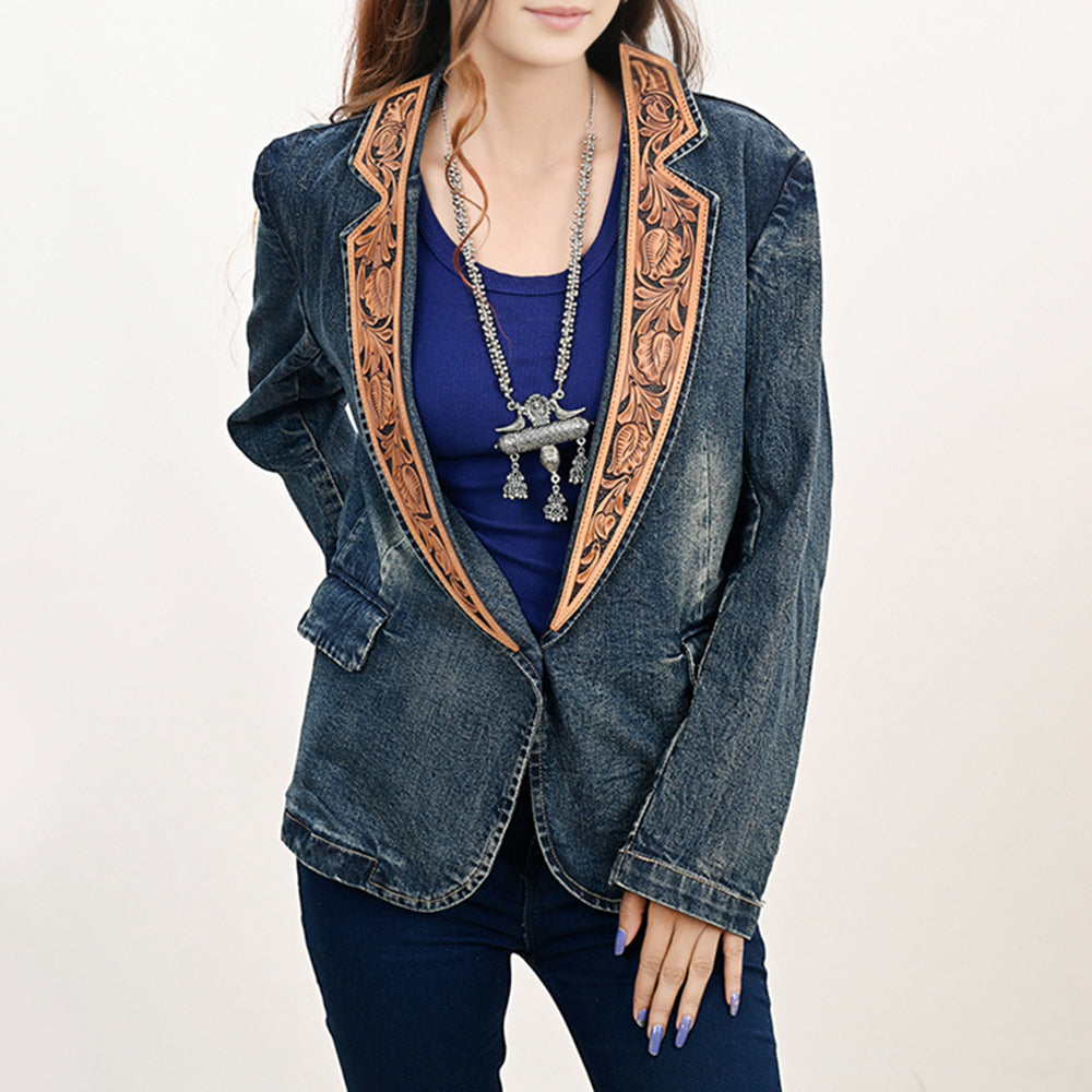 ADBZ043 Genuine leather Hand tooled Women 100% Cotton Denim Blazer dress jacket