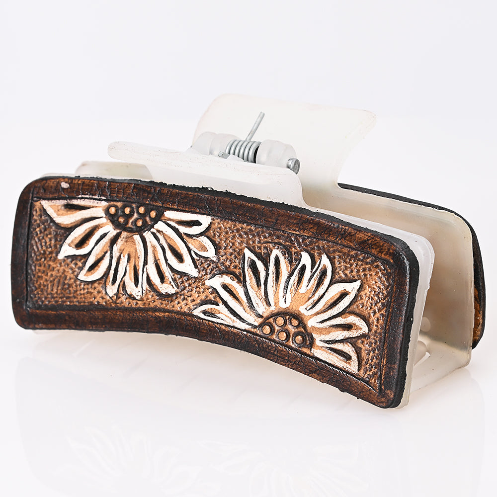 ADHC105 Sunflower Hand-Tooled Leather Hair Band Clip Clutcher - Rustic White & Brown | American Darling
