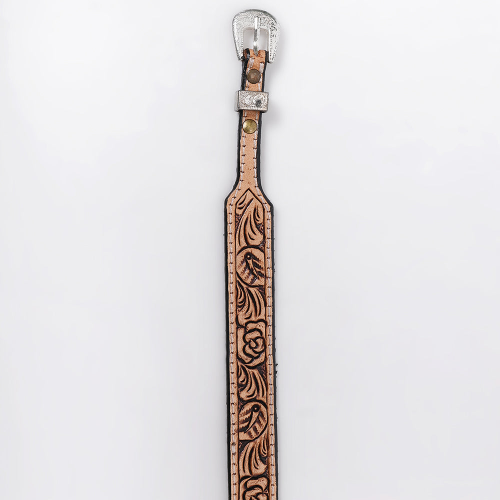 Bring the spirit of the West to your wardrobe with this beautifully hand-tooled floral Western belt. Made from natural tan leather, this belt features intricate flower and scroll detailing with expert craftsmanship. The silver-tone engraved buckle, keeper, and tip add a polished, vintage-inspired finish, while the double stitching provides durability and charm. A perfect fit for rodeo fashion, denim days, or adding a Western twist to any outfit.