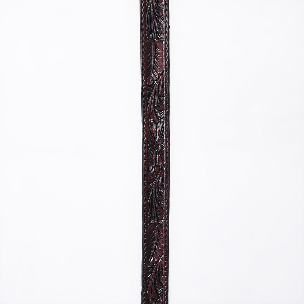 Capture timeless Western elegance with this rich dark brown leather belt, masterfully hand-tooled with a floral and scroll pattern. The deep contrast in the tooling highlights the craftsmanship, while the engraved silver buckle, keeper, and tip offer a polished vintage finish. Reinforced with white contrast stitching, this belt delivers durability and a refined look. Perfect for cowgirls, ranch wear, or adding rustic flair to modern Western outfits.