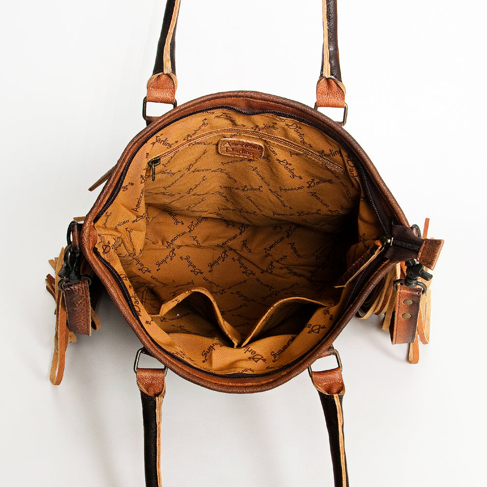 Celebrate authentic Western artistry with this American Darling tote, handcrafted from a traditional handwoven saddle blanket and genuine full-grain leather. The vibrant Southwestern pattern, paired with rich brown leather and flowing fringes, creates a timeless piece that reflects rustic luxury.