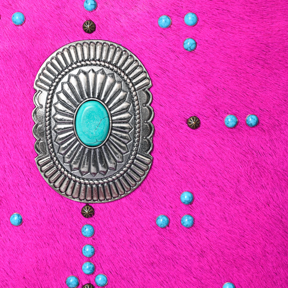 Make a bold, unforgettable entrance with this unique handcrafted crossbody from American Darling. The striking square body features genuine hair-on cowhide dyed a vibrant hue and accented with studs and a prominent silver concho with a central stone. The bag’s unique top handle is crafted from natural bamboo rings, fusing authentic Western elements with exotic, glamorous design.