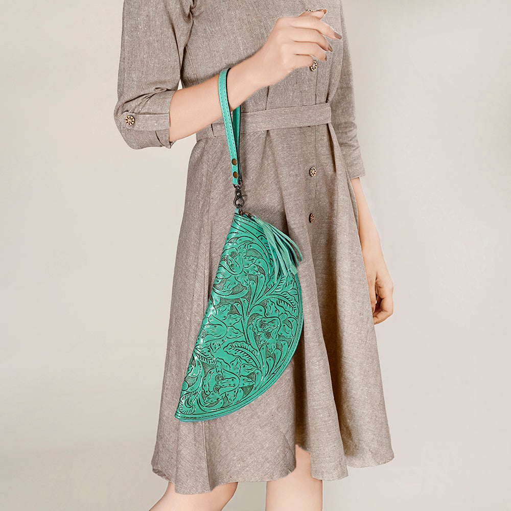 This handcrafted Taco by American Darling is made from premium genuine leather and features masterful hand-tooled floral carving. Built for comfort and everyday usability, its structured silhouette and wristlet strap make it easy to carry while keeping essentials secure and accessible.