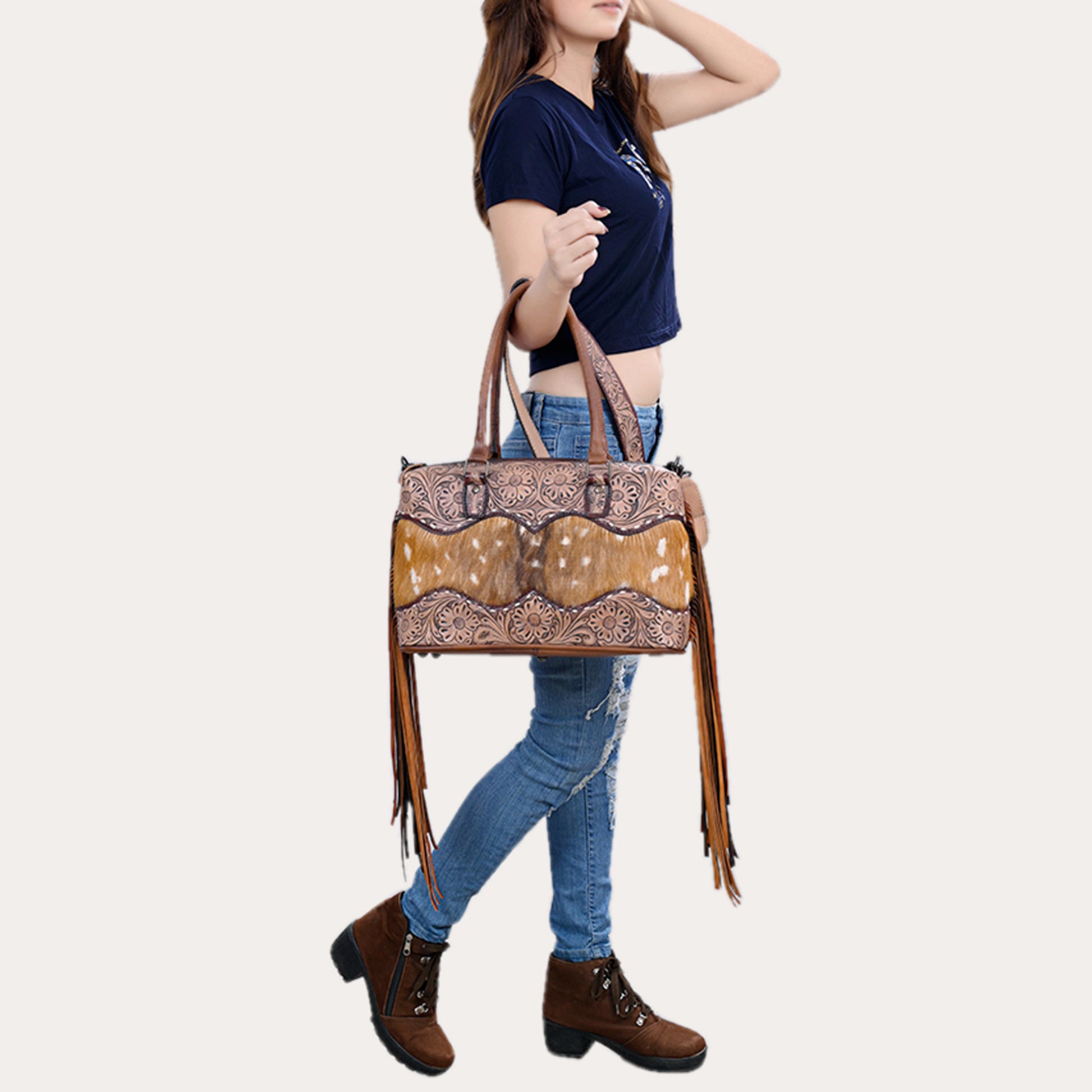 ADBG1258 American Darling Hand-Tooled Leather & Hair-On Cowhide Western Tote Bag with Fringe - Genuine Leather