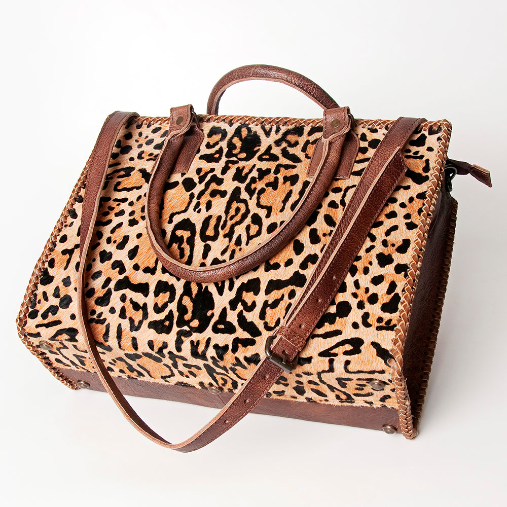 Make a fierce Western fashion statement with this handcrafted printed tote bag. Made from genuine hair-on cowhide with an eye-catching pattern, this tote combines bold style with classic construction. The full-grain leather handles and crossbody strap offer durability and versatile wear. Decorative whipstitching along the edges adds a rustic handmade touch. Spacious and structured, it's perfect for everyday use, travel, or a standout accessory on the rodeo or boutique circuit.