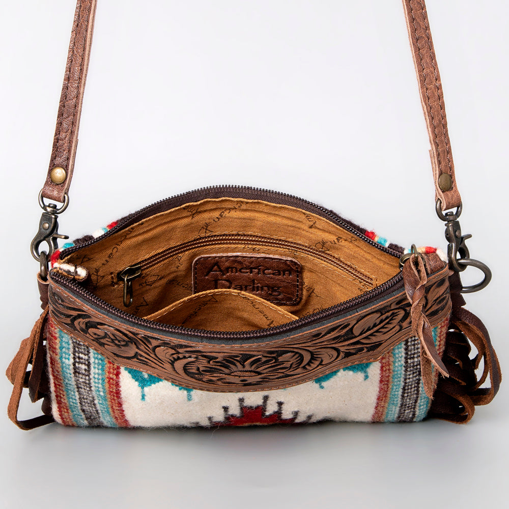 ADBG236 Southwestern Handwoven Crossbody Bag with Hand-Tooled Leather Flap and Long Fringes