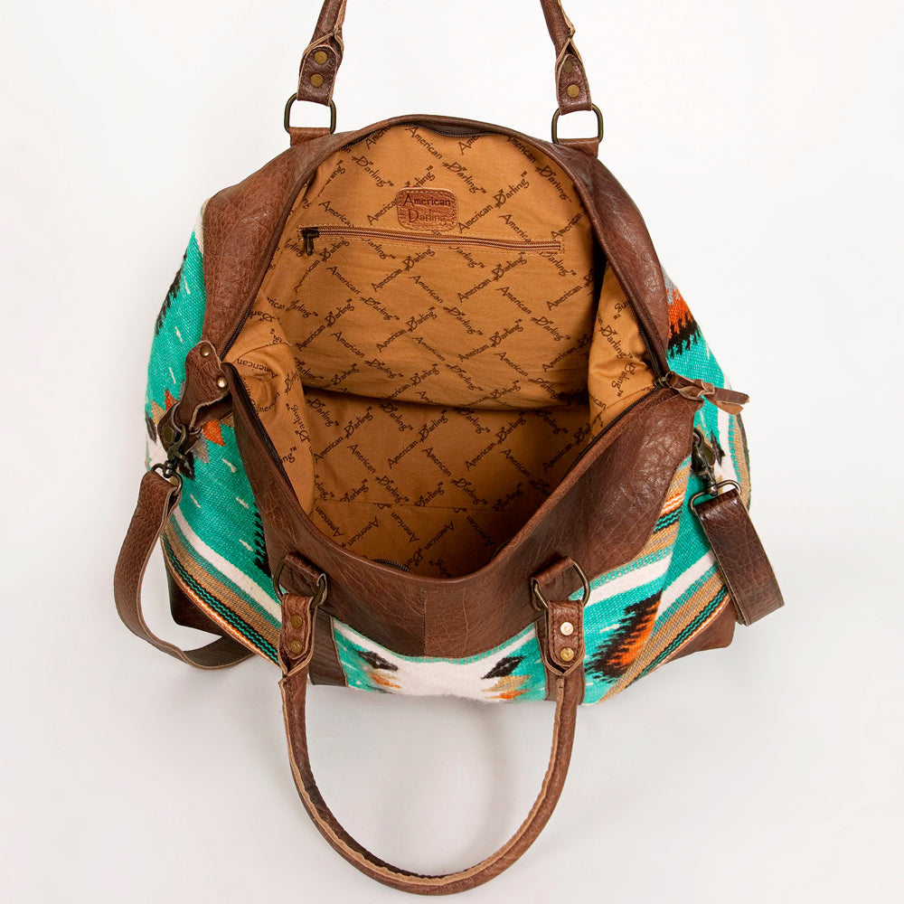 Make a bold statement on your next journey with this handcrafted Western leather duffel bag by American Darling. This unique piece blends rugged functionality with stunning artisan detail—featuring a meticulously handwoven wool saddle blanket in vibrant Southwestern motifs and rich, full grain cowhide leather.