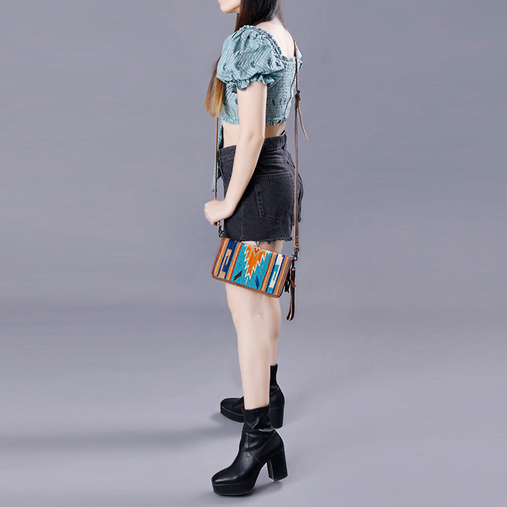 Bring bold Western energy to your everyday carry with this stunning wool organizer bag. Handwoven in a geometric tribal pattern, this compact crossbody features genuine leather trim for durability and classic flair. The bag includes a leather strap and secure compartments—ideal for storing your phone, cards, keys, and more. It's a vibrant choice for festivals, markets, or daily adventures.