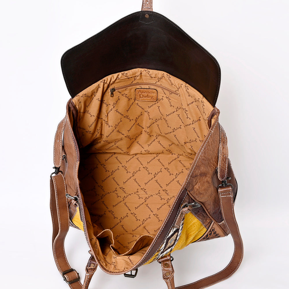 Travel in timeless Western style with the Tooled Leather & Saddle Blanket Duffel Bag by American Darling. This handcrafted masterpiece combines luxurious full grain leather with a vibrant, handwoven wool saddle blanket in a bold yellow backdrop, accented by Southwestern geometric motifs in red, turquoise, and navy.
