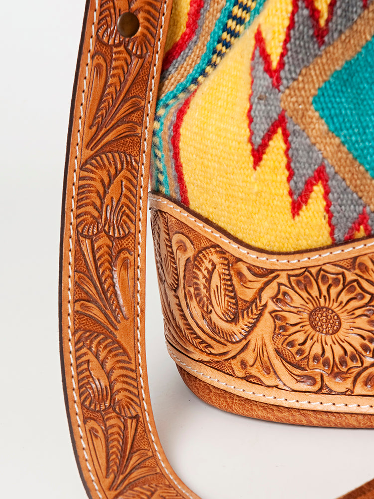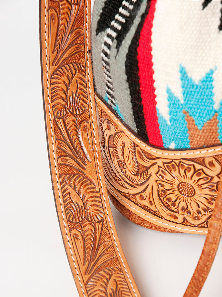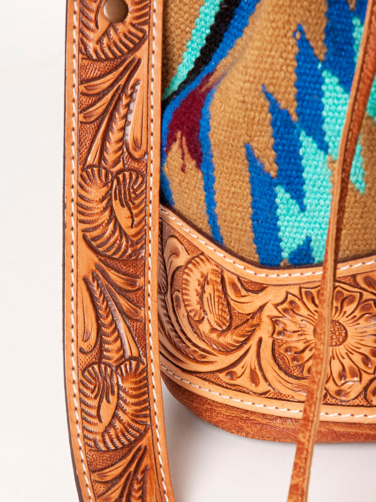 The shoulder strap is adjustable and made of 100% genuine vegetable tanned Cowhide Leather with a hand tooled pattern.