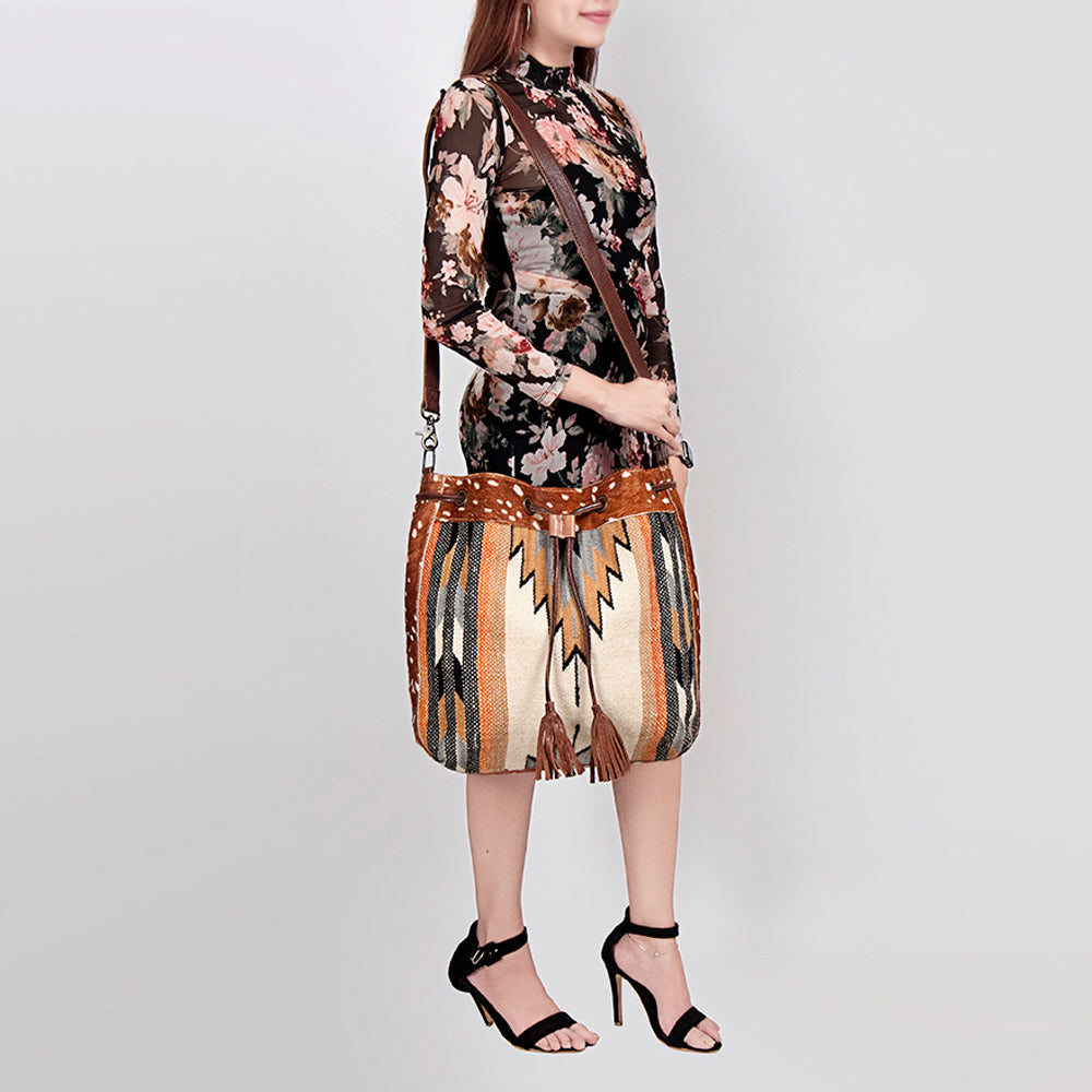 LC-ADBG574 Southwestern Wool Bucket Bag Drawstring Tote with Leather Strap