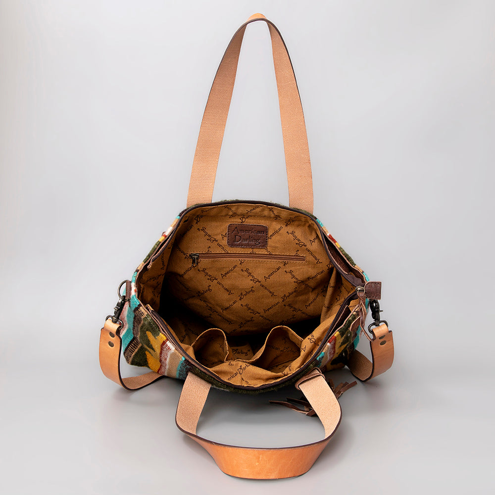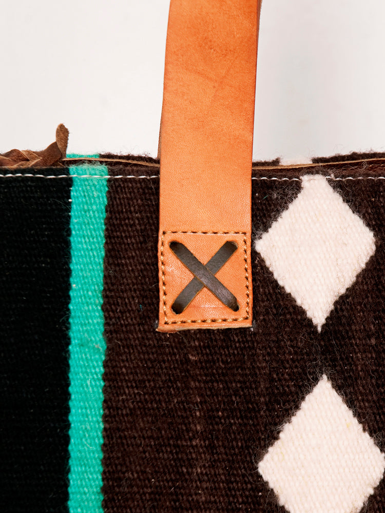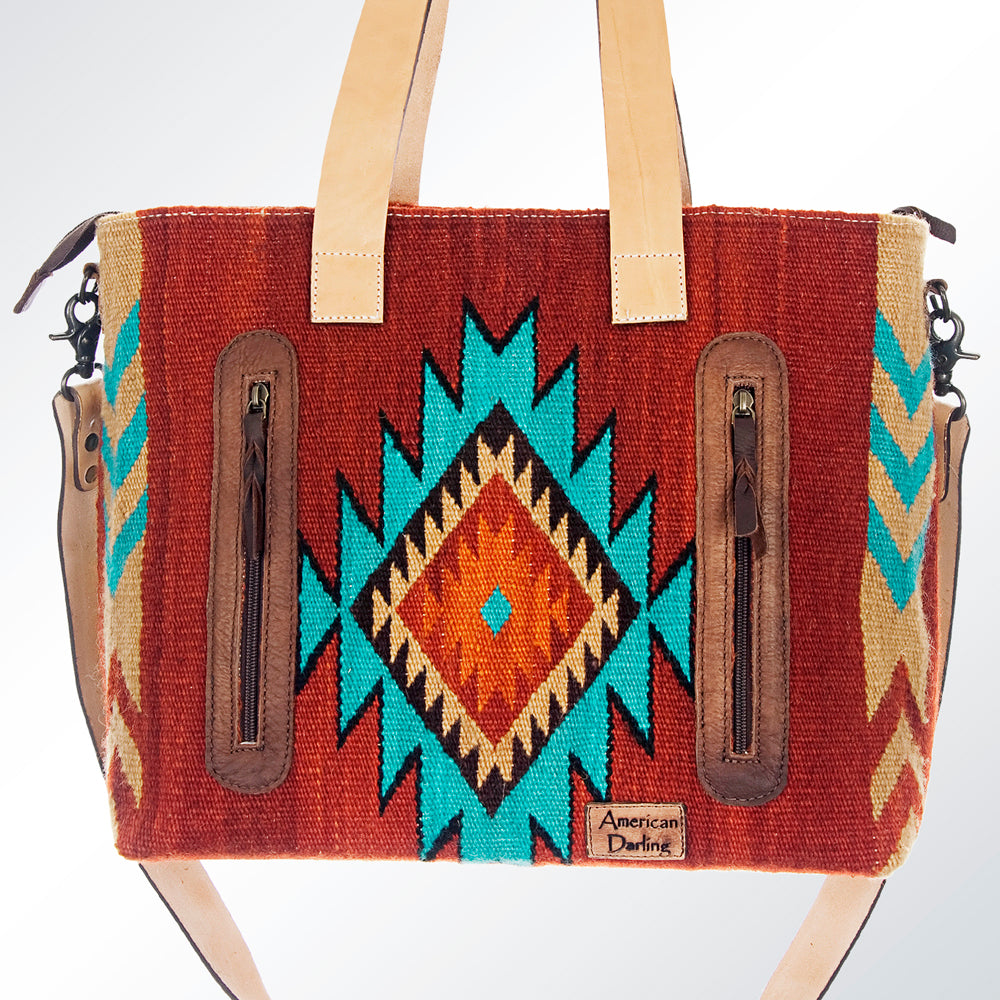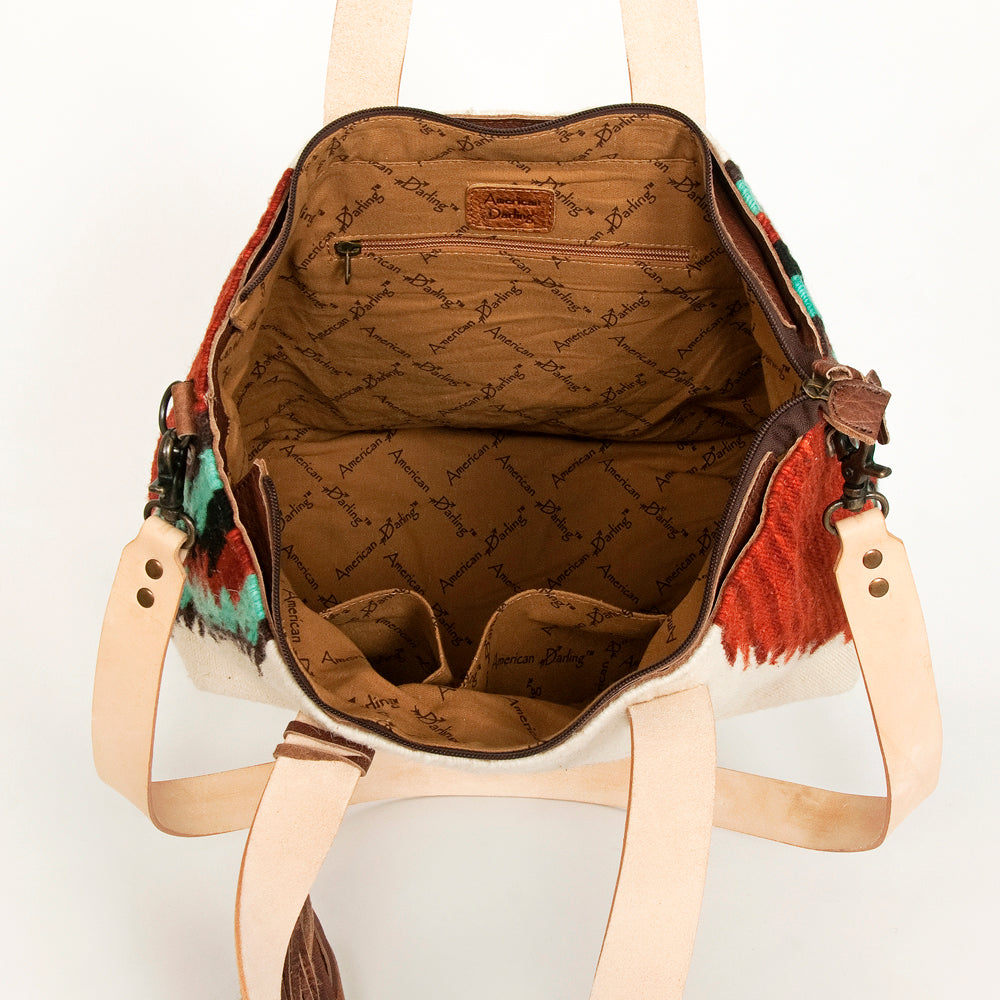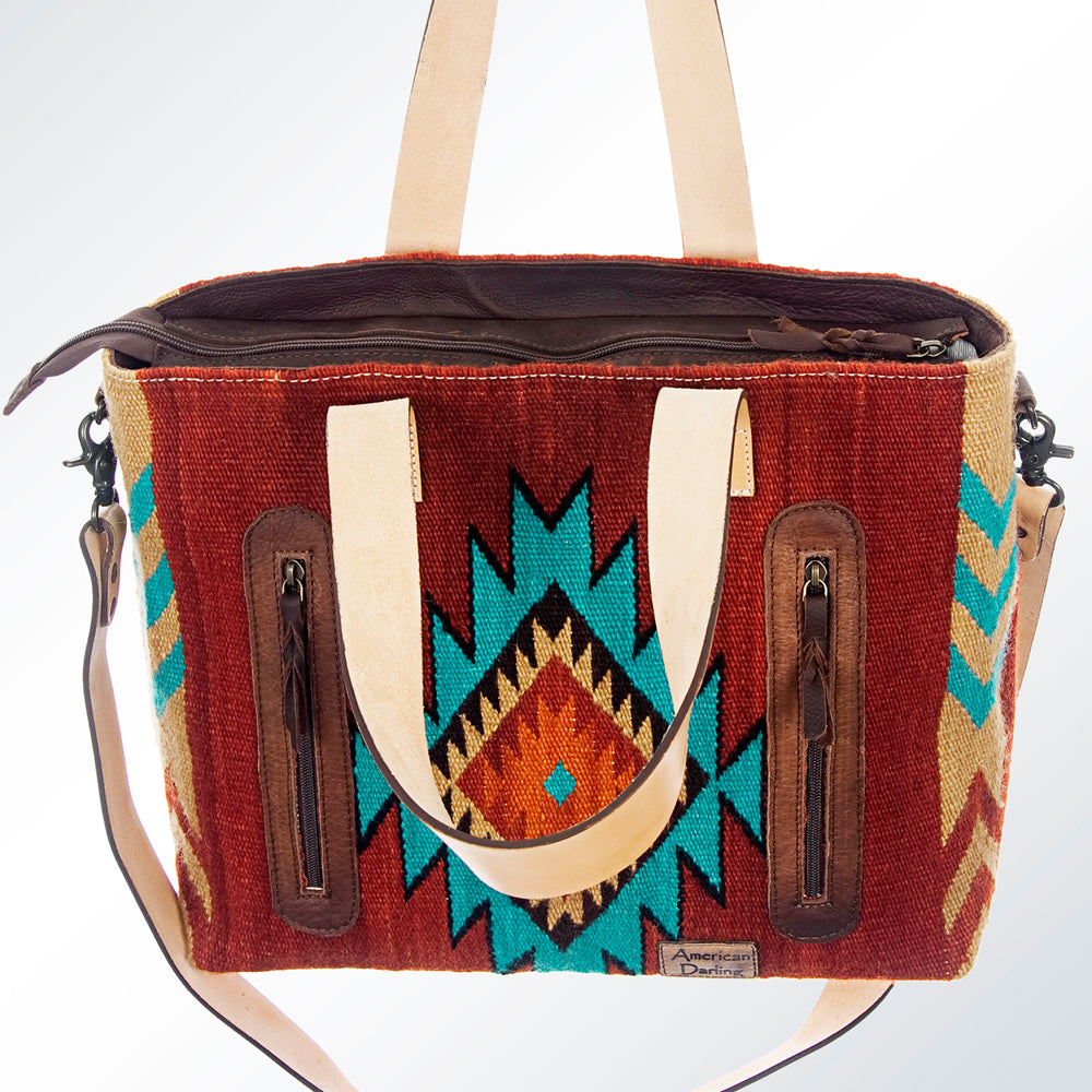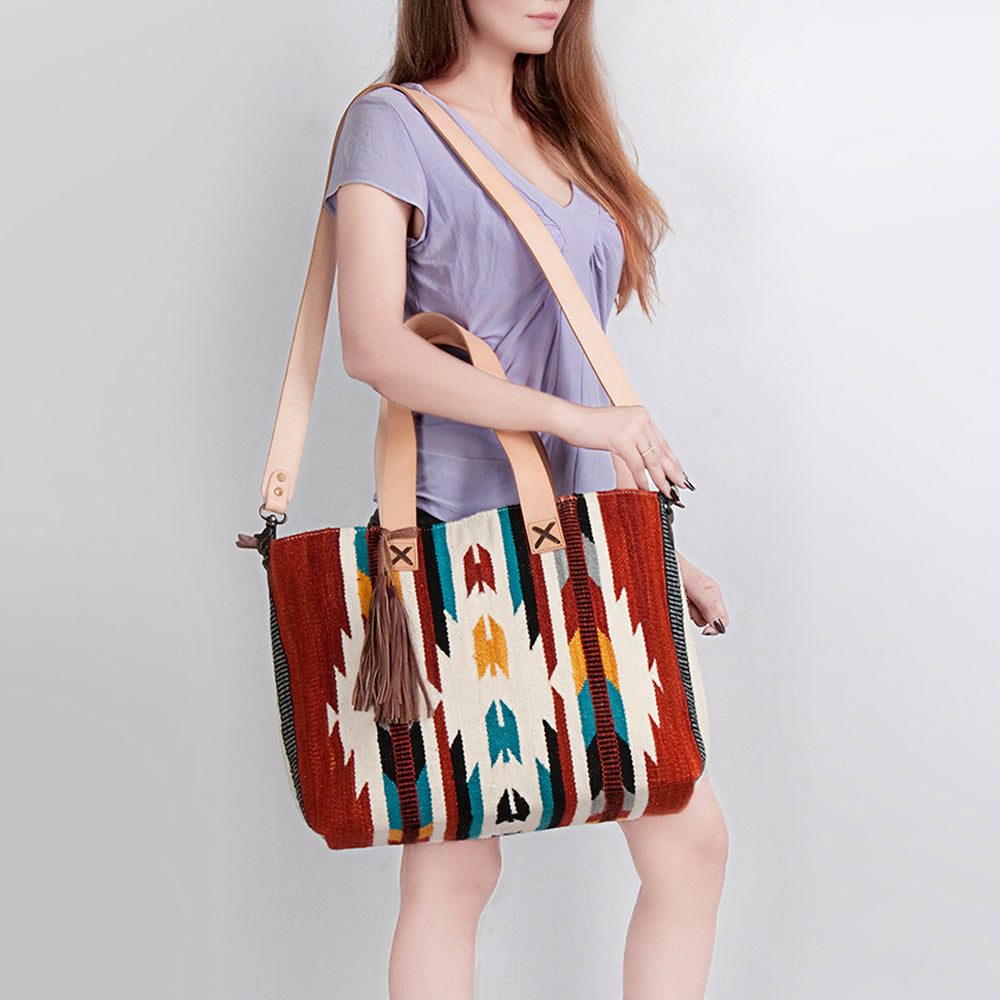 LC-ADBG575D Southwestern Wool Tote with Natural Leather Straps Handwoven Tribal Pattern & Tassel