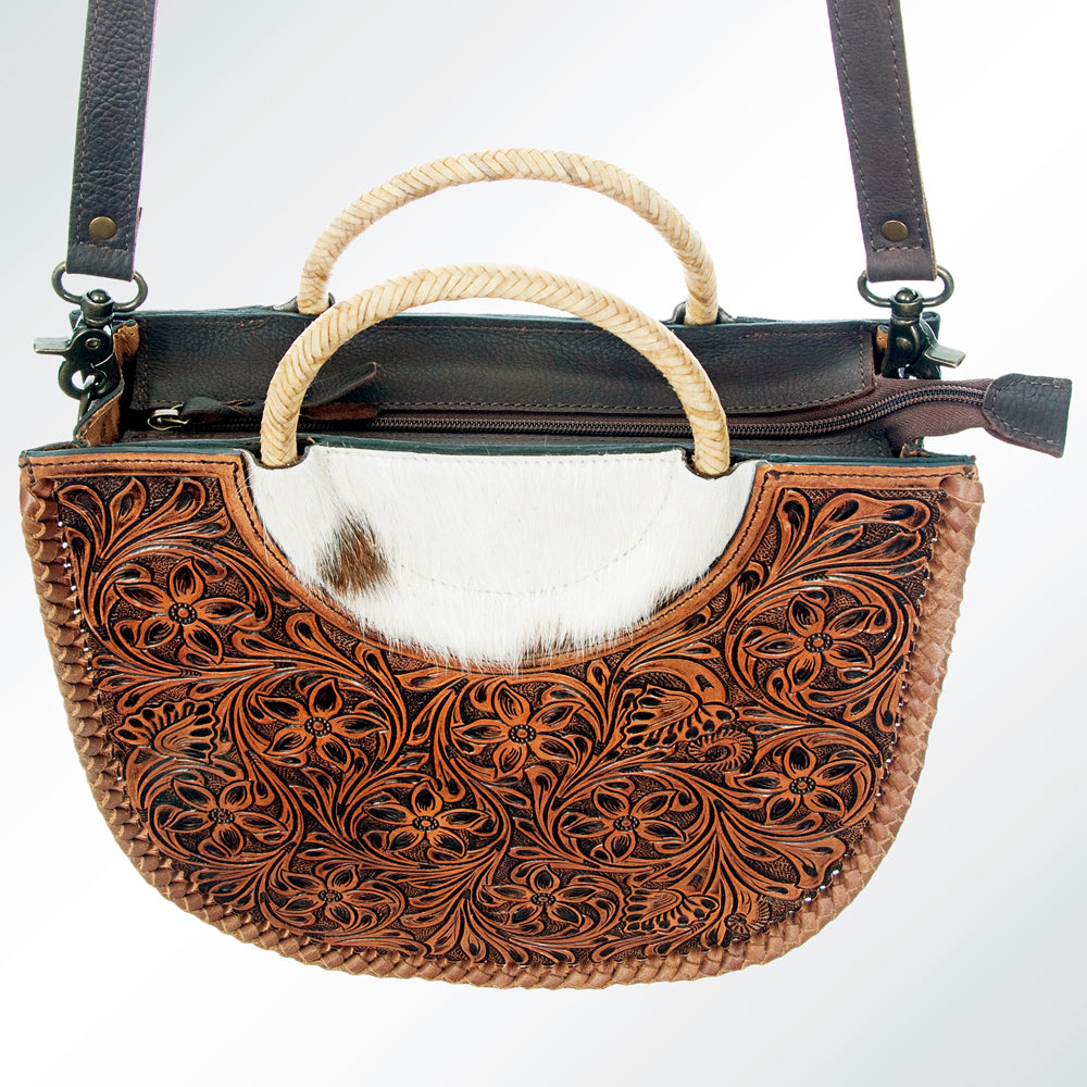 LC-ADBG589 Tooled Leather and Cowhide Half-Moon Tote Floral Carved Western Bag with Woven Handles
