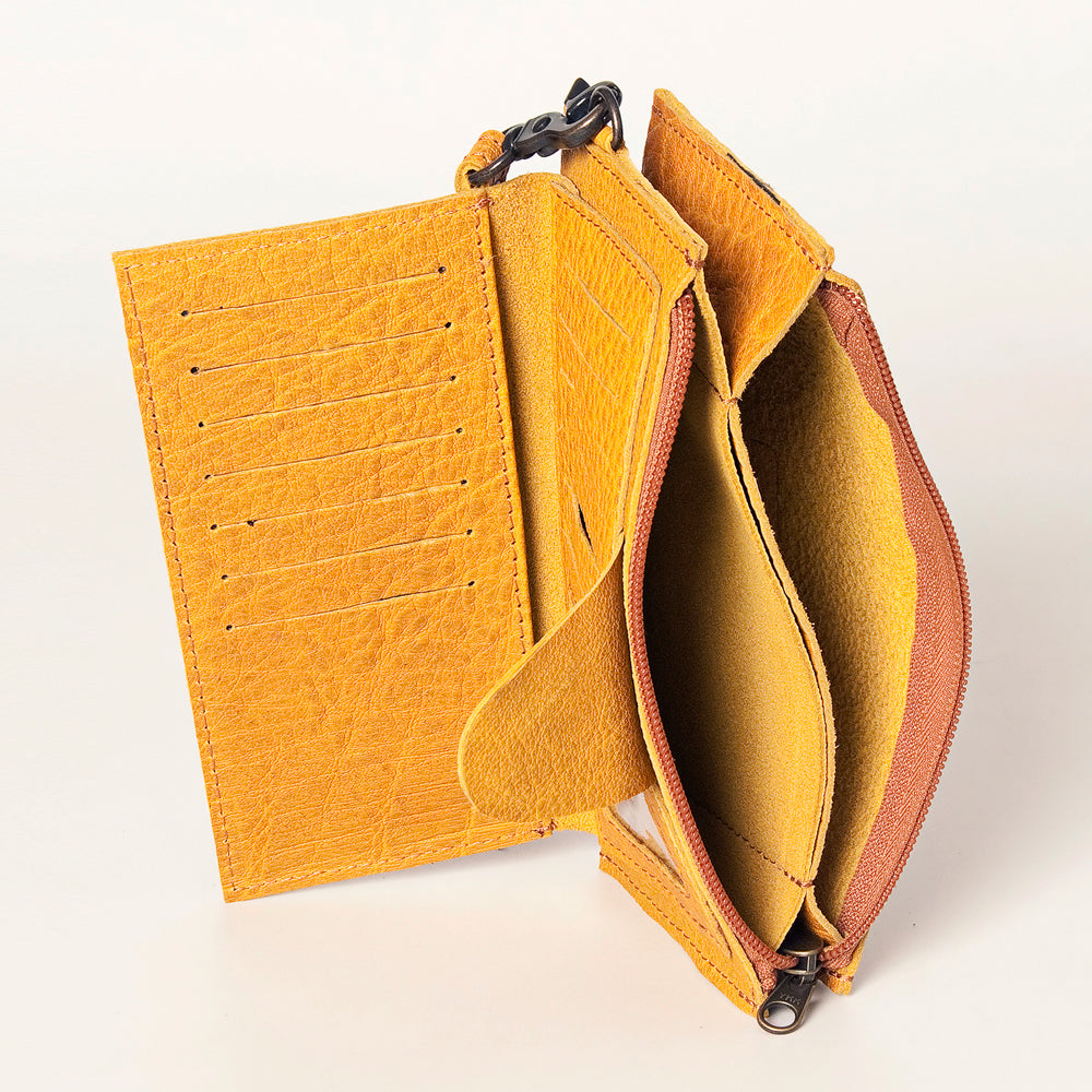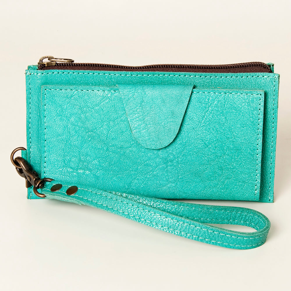 The compact profile includes a secure zipper top closure, an exterior snap card slot for quick access, and a detachable wrist strap for easy carrying. Finished with antique metal hardware and YKK zipper closure, it offers timeless western charm in a practical format.