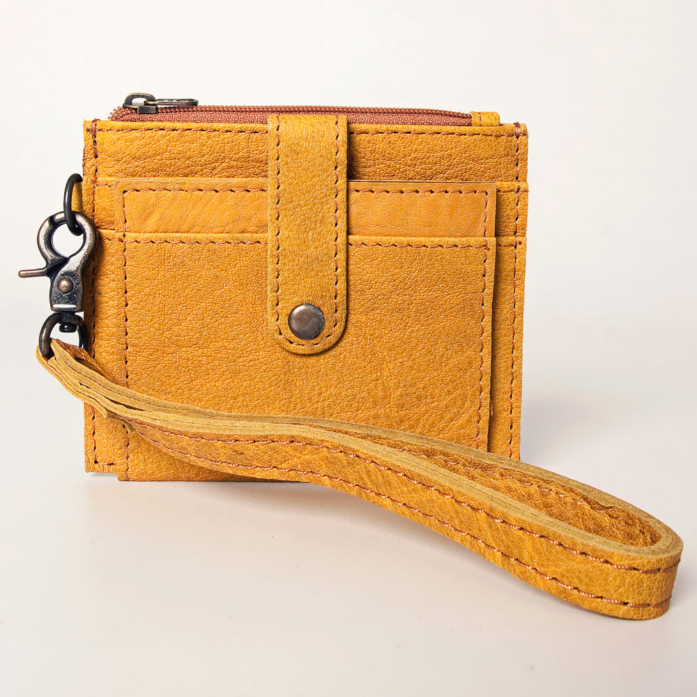 This bright wristlet wallet brings bold style and Western spirit to your everyday essentials. Crafted from genuine full-grain leather, this compact wallet features exterior card slots secured with a snap-tab closure and a zippered compartment for coins, cash, or small valuables.