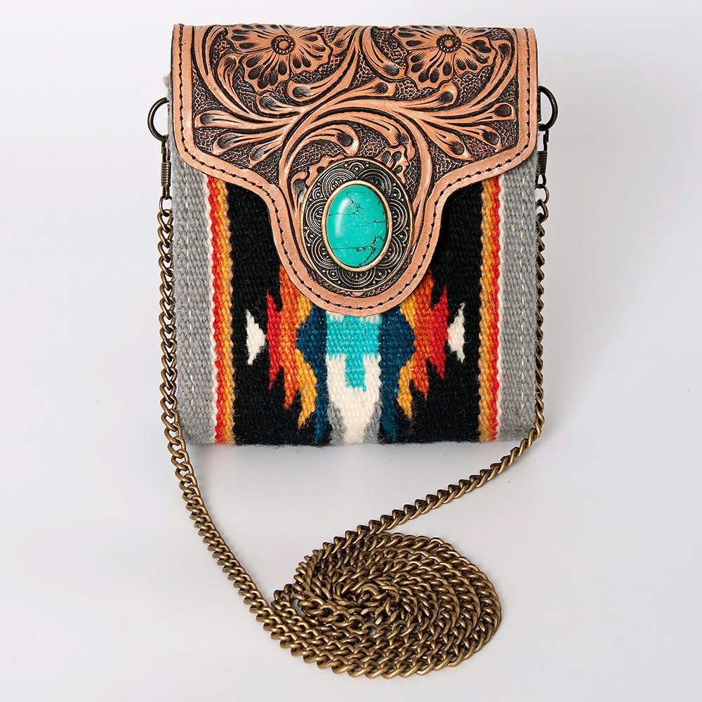 Infuse your outfit with bold Western elegance. This mini crossbody bag is handcrafted from rich, Southwestern saddle blanket fabric and topped with a hand-tooled genuine leather flap featuring a floral design and turquoise stone centerpiece. Compact yet eye-catching, this piece is perfect for light outings, rodeos, or concerts.