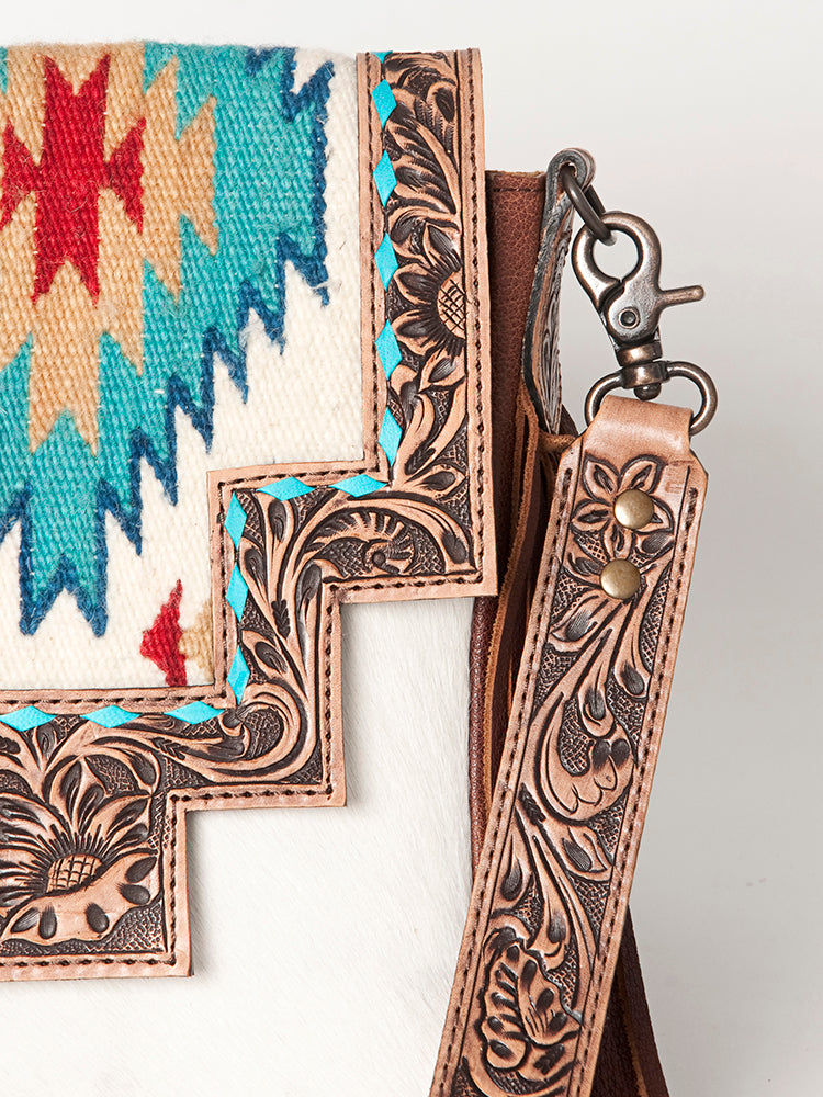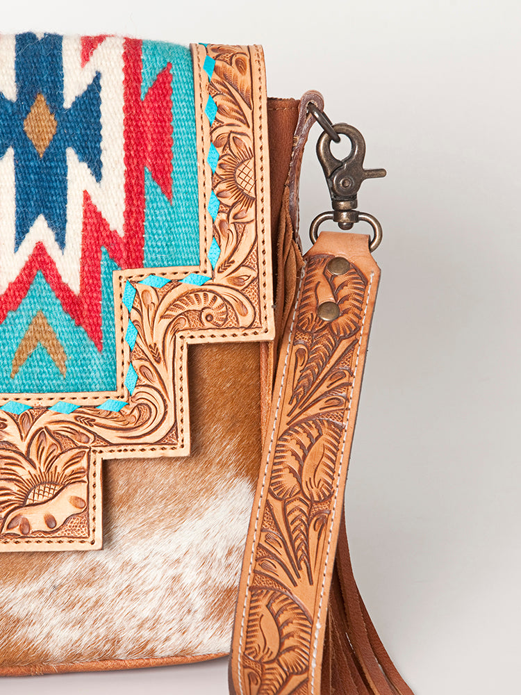 LC-ADBG856 Western Cowhide & Saddle Blanket Messenger Bag with Hand-Tooled Leather and Fringe American Darling