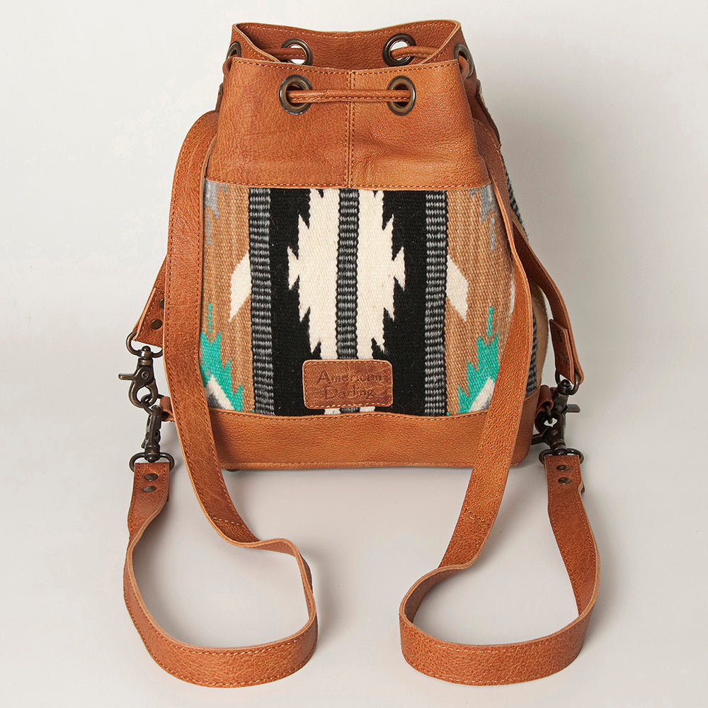 Elevate your Western wardrobe with the charm of this American Darling Leather Bucket Bag, a perfect blend of rustic elegance and modern versatility. Featuring a structured drawstring silhouette, this bag is crafted from rich full-grain leather and adorned with a hand-woven wool saddle blanket in vibrant Southwestern patterns.