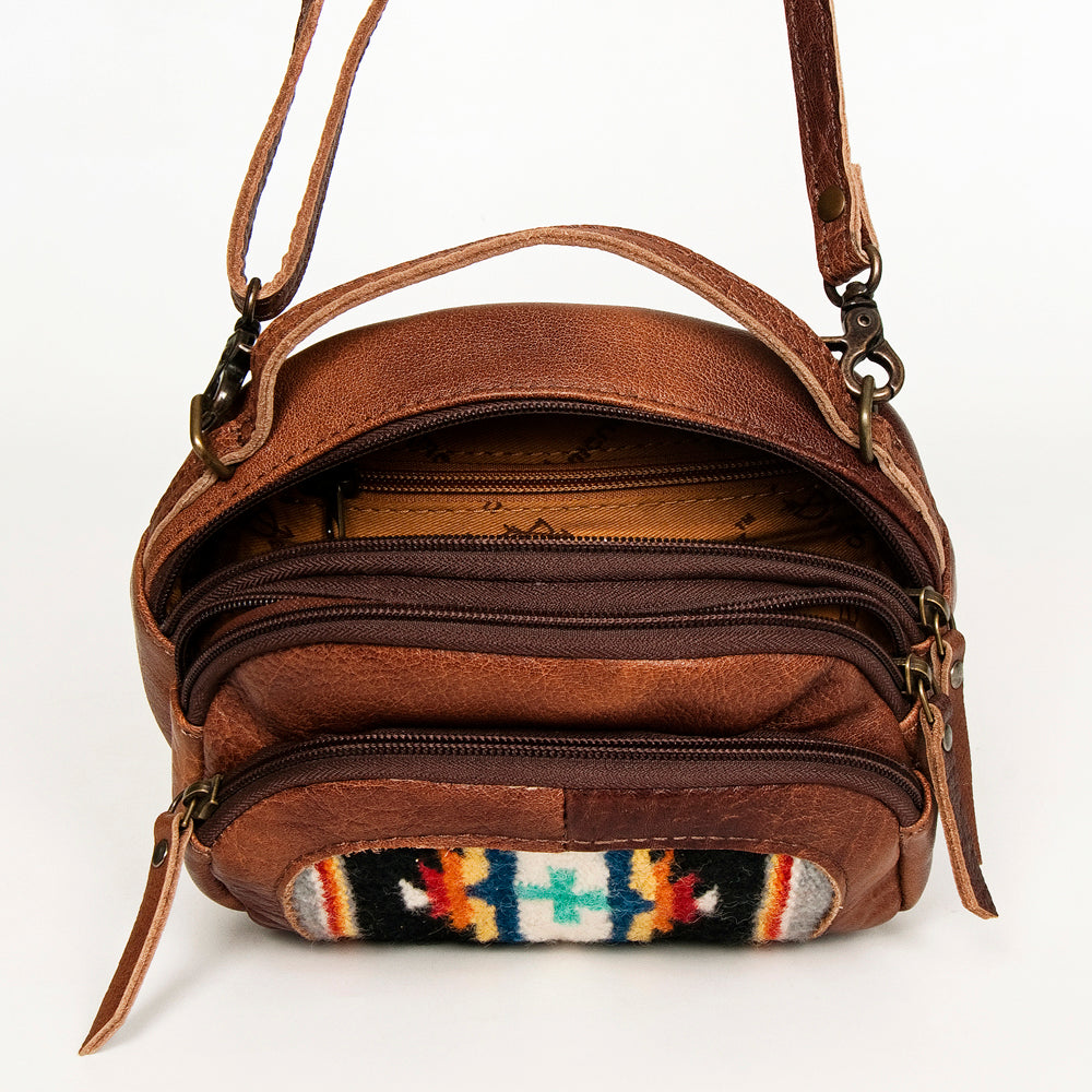 Carry your essentials in true Western style with this handcrafted mini camera bag. The front showcases a vibrant wool saddle-blanket panel with geometric motifs, framed by buttery full-grain leather. Dual zippered compartments keep gear organized, while braided leather zipper pulls and side slip pockets add practical flair. Wear it by the top handle for quick grab-and-go or attach theLeather crossbody strap for hands-free adventures.