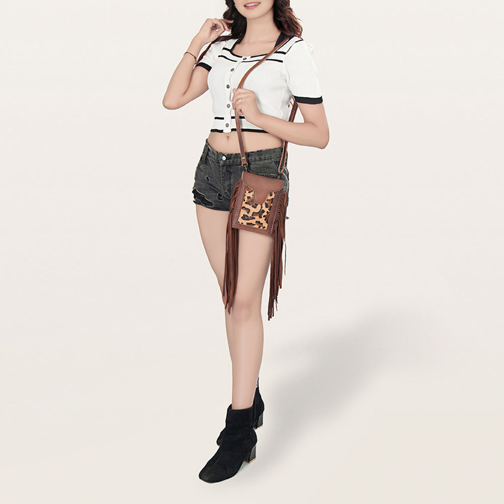 LC-ADBG943A Leopard Print Fringe Leather Cell Phone Crossbody Western Mini Bag by American Darling