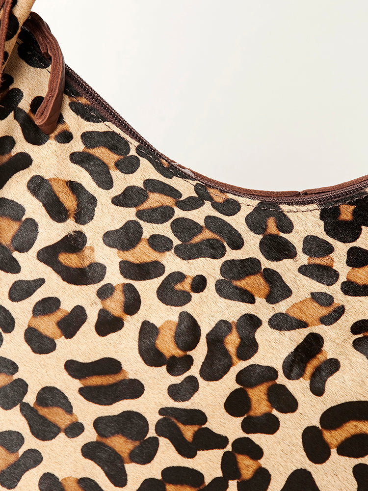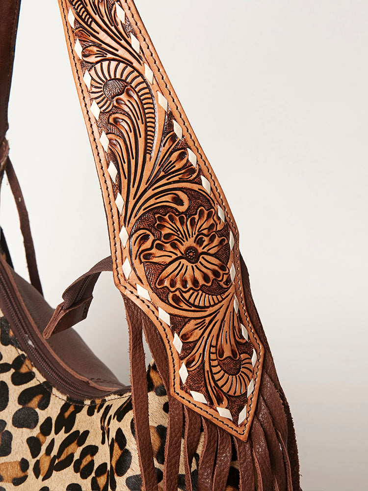 Unleash your wild Western side with this eye-catching American Darling hobo bag. Crafted from premium hair-on cowhide with a bold leopard print pattern, this shoulder bag features a hand-tooled leather strap and classic fringe detailing. It's where rugged meets chic perfect for rodeo nights, festivals, or everyday flair.