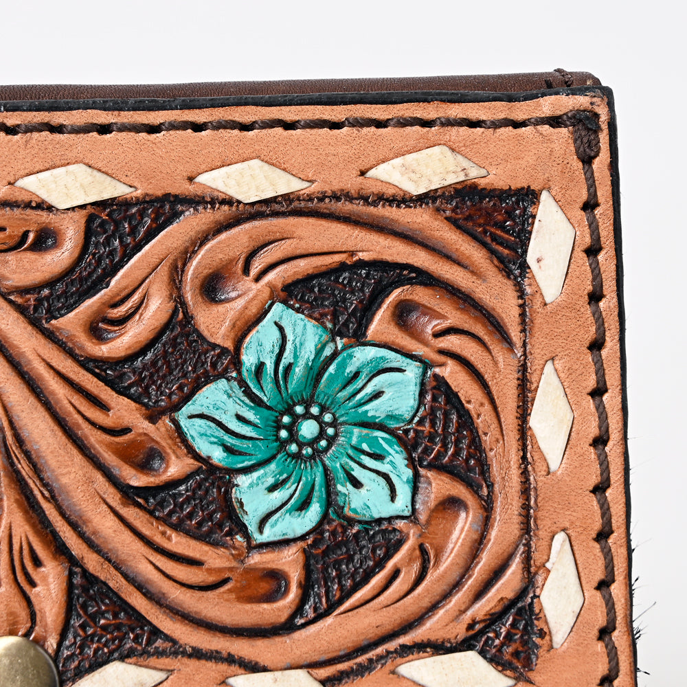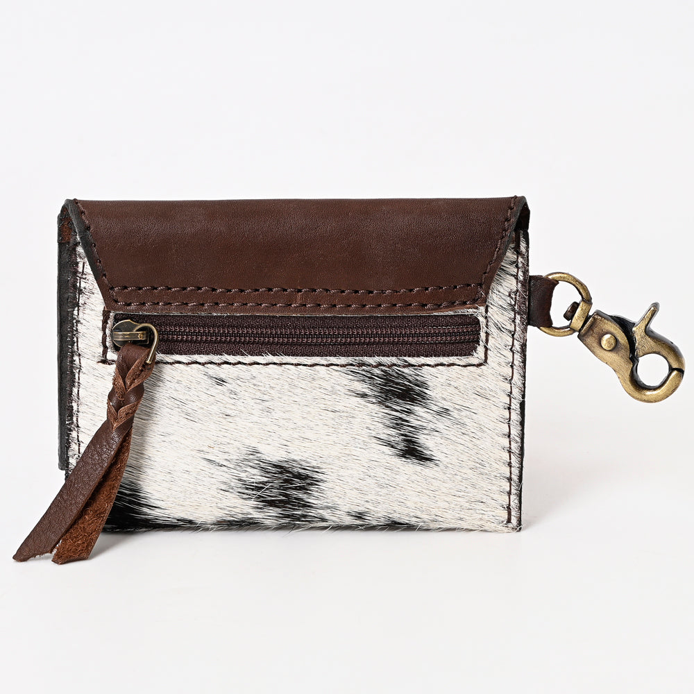 This handcrafted leather Coin Purse combines style and convenience in a compact form. Featuring a hand-tooled floral design with flower, this wallet adds a pop of Western charm. The hair-on-hide trim and antique brass clasp provide rugged functionality, making it perfect for on-the-go essentials like cards, cash, or keys.