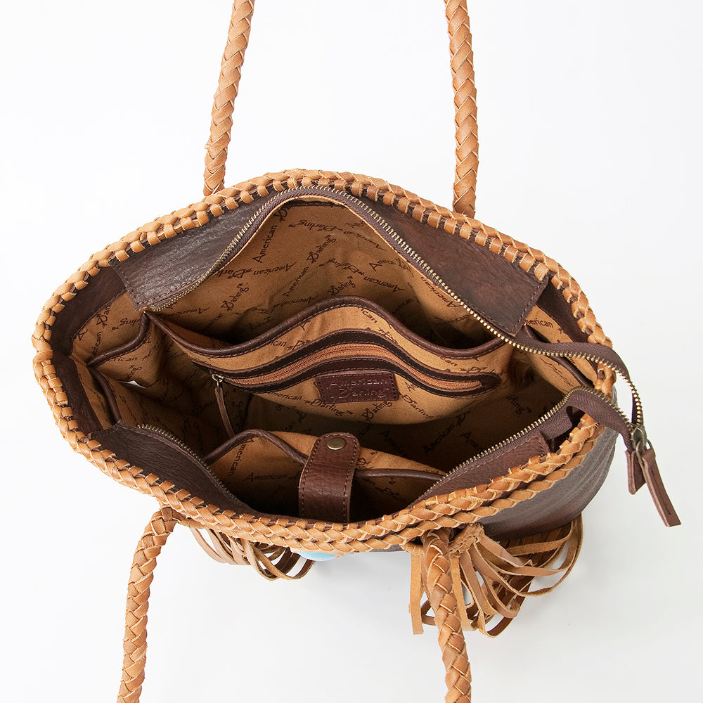 LC-ADBGD128B Brown Leather Tote Bag with Turquoise Concho & Braided Fringe Handles