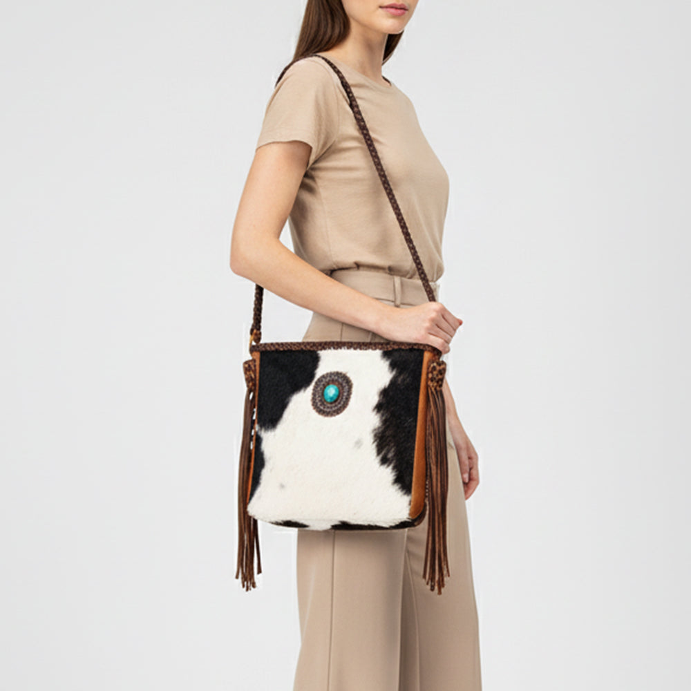 Channel bold Western flair with this artisan-crafted cowhide leather tote. Made from genuine hair-on hide, this tote is accented with a striking turquoise concho at the center, bordered by detailed beading. Rich brown braided leather straps and matching trim elevate its rustic charm, while Genuine suede side panels and flowing fringe add movement and texture.