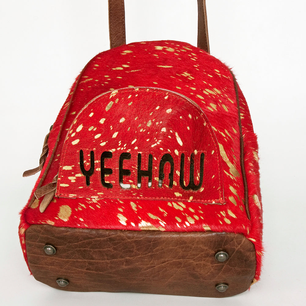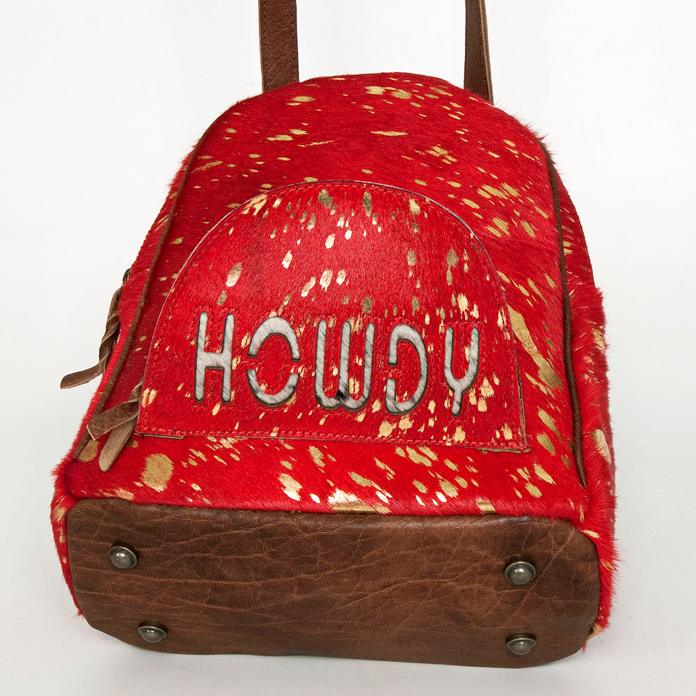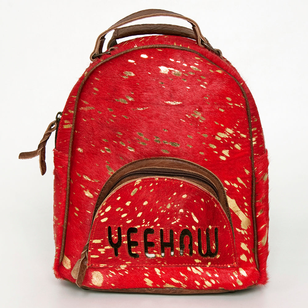Say HOWDY in bold Western style with this show-stopping red mini backpack. Handcrafted from genuine hair-on cowhide leather and detailed with metallic gold splashes, this bag brings the rodeo spirit to life.