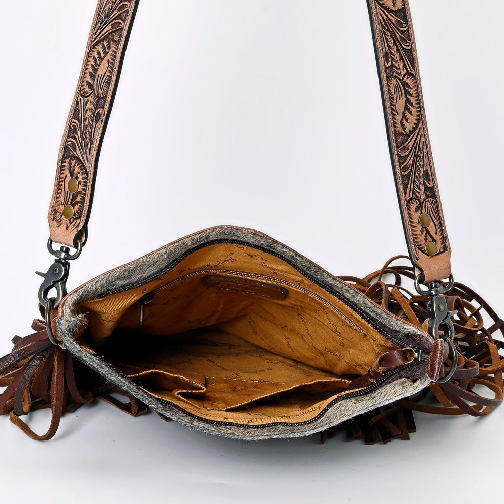 LC-ADBGS192 Cowhide Large Crossbody Bag with Tooled Patch, Fringe & Floral Strap - Western Boho Purse