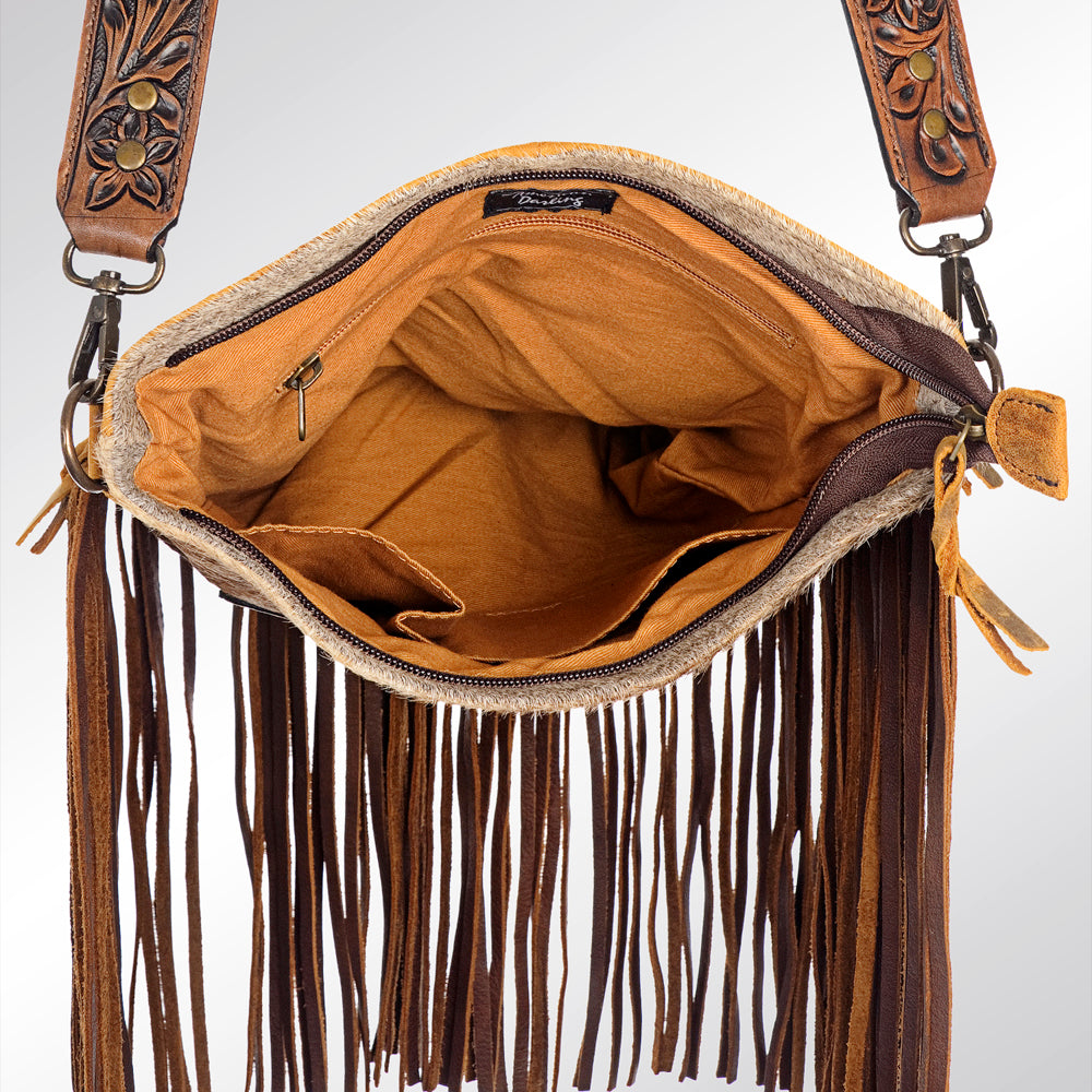 Bring bold Western charm into your everyday wardrobe with this Cowhide Crossbody Bag, beautifully accented by a detailed style tooled leather patch. Crafted from genuine hair-on hide and finished with long Genuine suede fringe and a tooled floral leather shoulder strap, this piece blends artisan craftsmanship with boho Western flair.