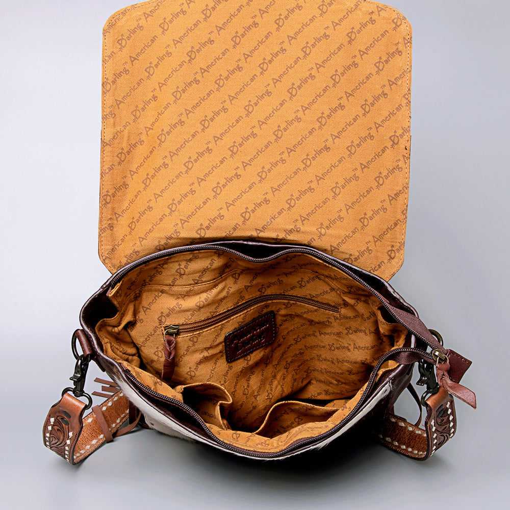 Channel the rugged elegance of the American West with this handcrafted cowhide leather Messenger bag. The front features a genuine hair-on-hide panel, perfectly paired with a richly detailed tooled leather flap adorned with classic floral scrollwork.