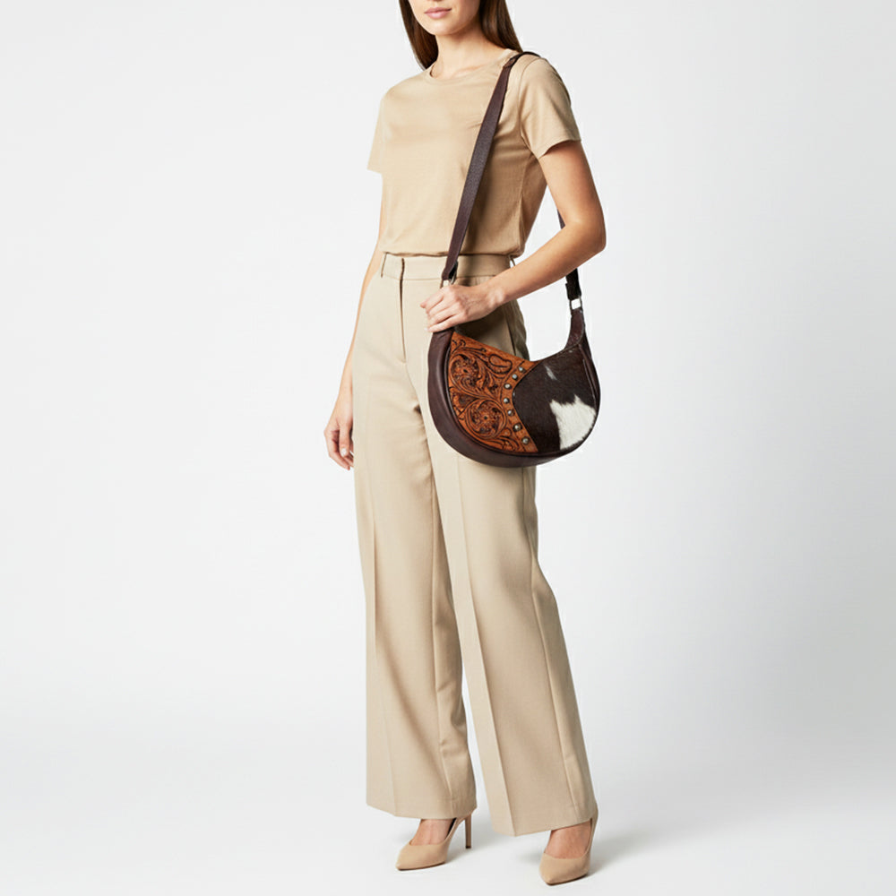 The handpicked cowhide hair-on genuine leather not only adds a soft and tactile element but also serves as an embellishment, enhancing its overall western appearance.