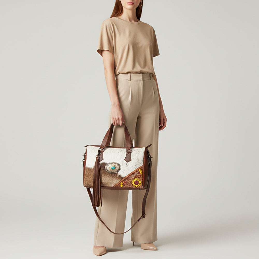 The handpicked cowhide hair-on genuine leather not only adds a soft and tactile element but also serves as an embellishment, enhancing its overall western appearance.