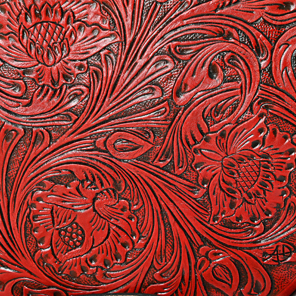 Detailed Hand tooled, carved and finally antique hand finished vegetable tanned American Cowhide Leather, exquisitely done by the finest artists and craftsmen in the country.