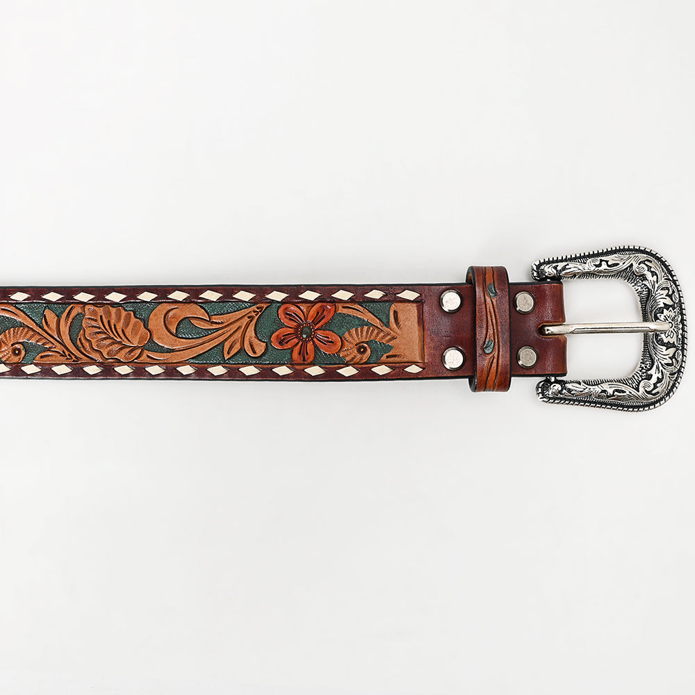 Add classic Western craftsmanship to your wardrobe with this beautifully hand-tooled leather belt. Featuring warm tan floral scrollwork over a deep green background, the design is framed with a bold white diamond border and completed with a silver engraved buckle. This genuine leather belt is durable, flexible, and artisan-crafted—perfect for cowgirls, cowboys, and Western fashion lovers alike.