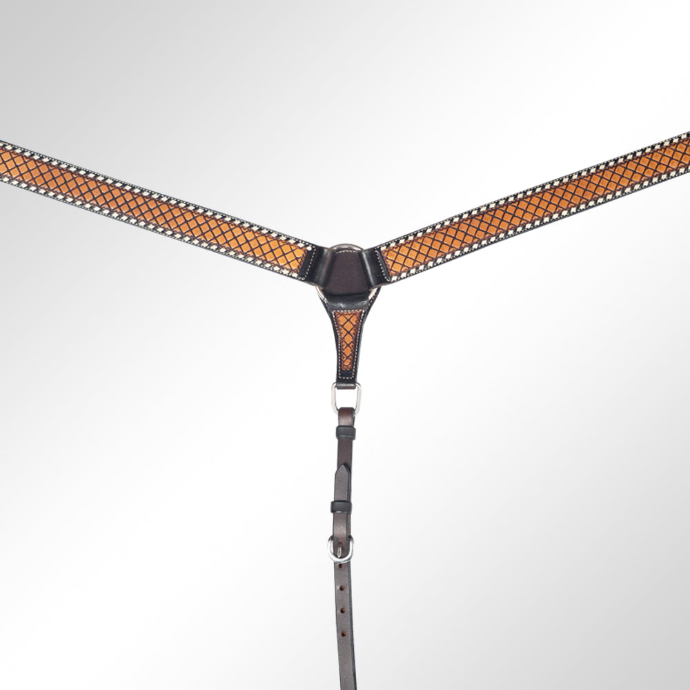 The pieces of this breast collar are hand carved and painted with extreme care for quality and attention to detail.