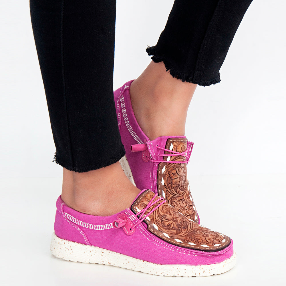 Turn heads in these bold magenta canvas slip-ons by American Darling, featuring genuine hand-tooled leather tops in a classic Western floral motif. Lightweight, comfortable, and full of rustic flair- these shoes bring together everyday wearability with artisan-crafted style.