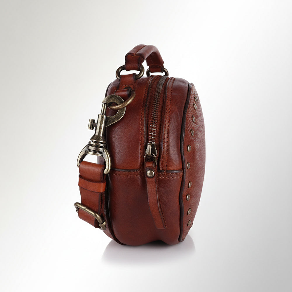 Distinctive Design: This circular Canteen bag silhouette is enhanced by an array of Rivets Embossed along the edge and a central buckle/strap detail, delivering a unique, rugged Western aesthetic.