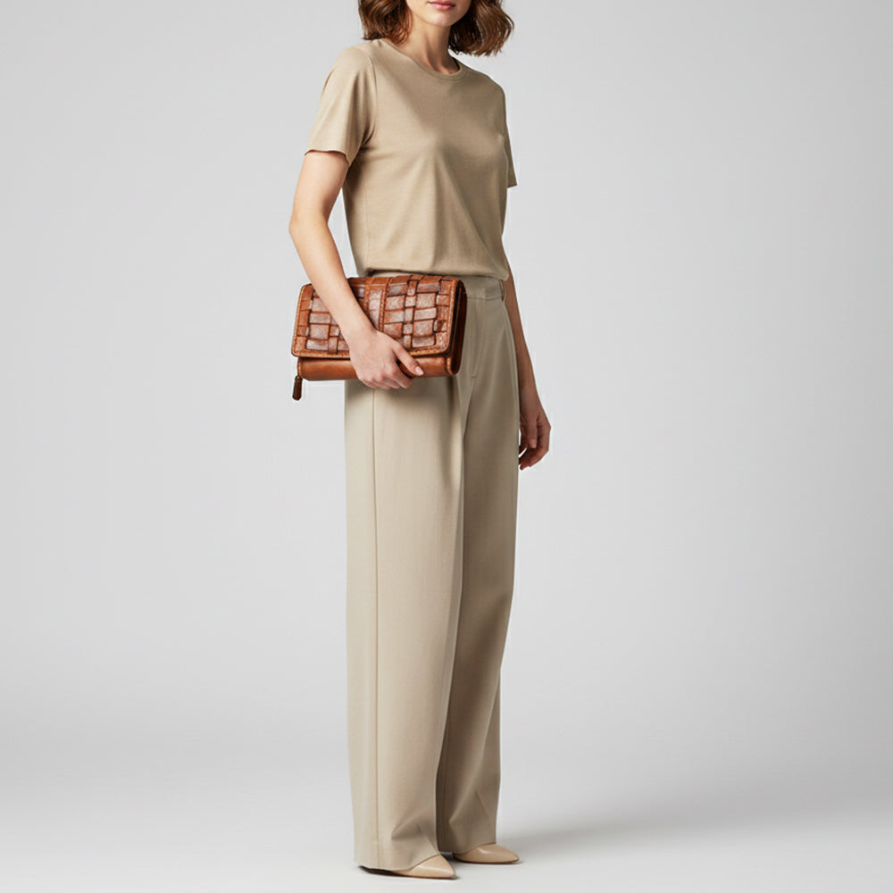 - Visible Features: The design is exceptionally Well-compartmentalized with an accordion-style interior featuring multiple card slots, dedicated currency sleeves, and a clear ID window, complemented by an internal zippered coin pouch, a secure rear external slip pocket, and a distinctive hand-braided leather exterior for a textured finish.