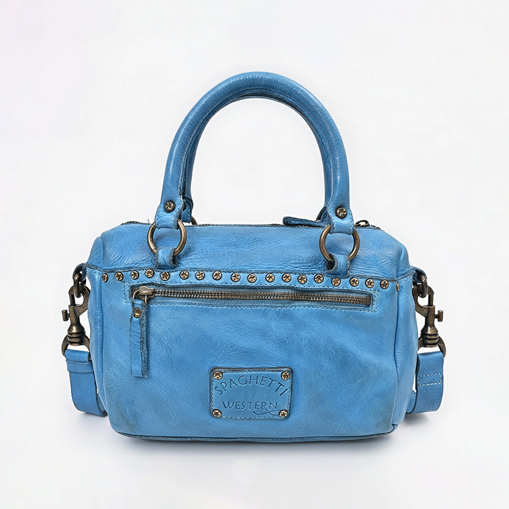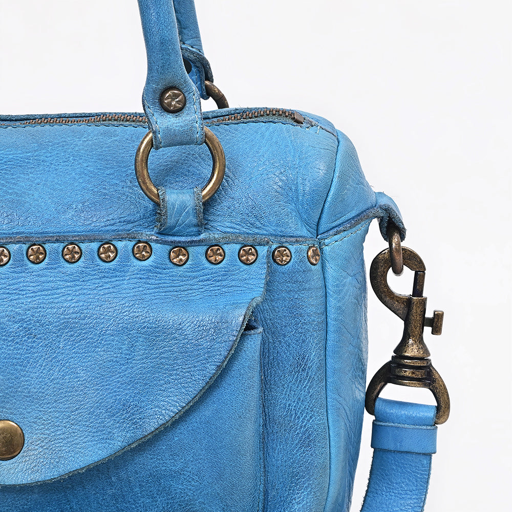 - Visible Features: The design is exceptionally Well-compartmentalized with a lined interior featuring multiple card slots, a dedicated zippered security pocket, and an internal clip, complemented by a front flap pocket with a magnetic snap, decorative brass-tone Rivetted studs, dual rolled top handles, and an adjustable, detachable leather shoulder strap for versatile carry.