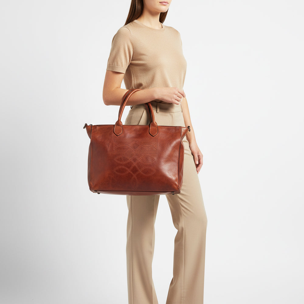 - Visible Features: The design is exceptionally Well-compartmentalized with a lined interior featuring a dedicated zippered security pocket and internal slip organization, all complemented by dual rolled leather top handles, a detachable leather shoulder strap, and a distinctive embossed decorative motif on the front panel.